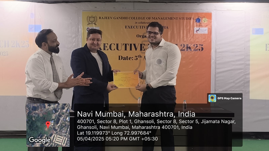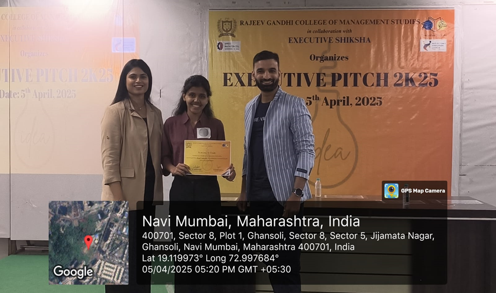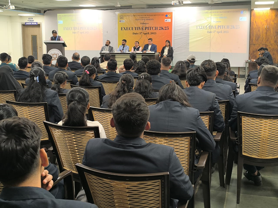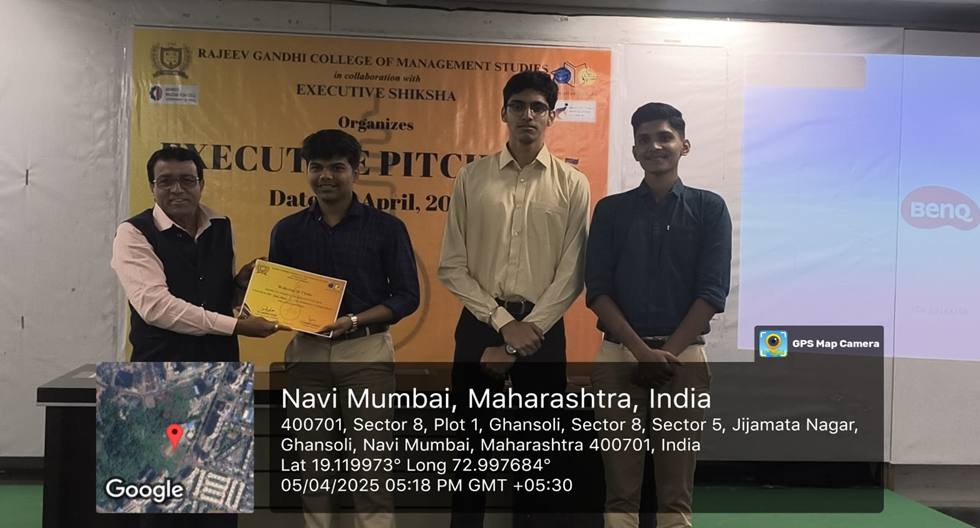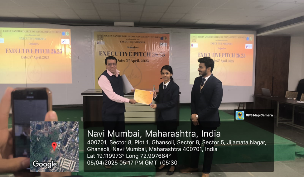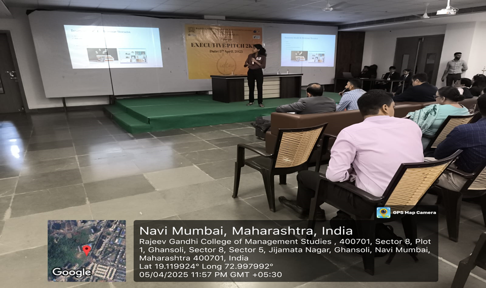 Rajeev Gandhi College of Management Studies under the IIC committee hosted the self-driven activity for over 3 days, and the final competition was held on 5th April,2025. Executive Pitch 2K25 was to provide a dynamic platform for students to showcase their innovative business ideas, enhance their entrepreneurial mindset, and develop essential pitching and presentation skills. The event aimed to foster creativity, strategic thinking, and industry-academia collaboration by engaging participants in real-time business pitching, evaluated by experienced professionals and entrepreneurs. Through this initiative, the college aimed to cultivate leadership qualities and empower students to transform their ideas into viable ventures. More than 20 teams participated and 100 + members participated in the event.
