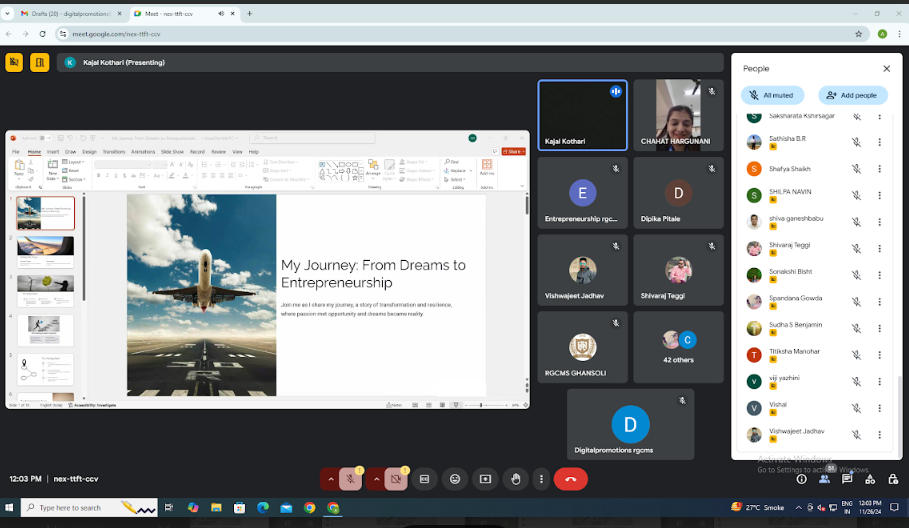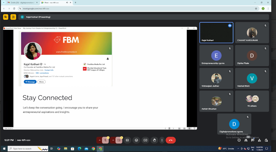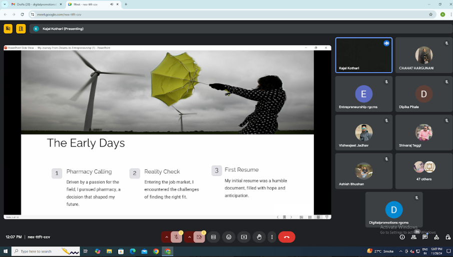 Kajal Kothari, co-founder of Fresh Box Media Pvt. Ltd., is a dynamic entrepreneur known for her expertise in digital marketing, branding, and content strategy. Starting her career as a pharmacy graduate and medical representative, she quickly rose to success, becoming the best MR in just eight months. This achievement inspired her to explore new avenues, eventually leading her to establish a thriving digital media agency with over 80 clients. Under her leadership, Fresh Box Media has gained recognition for its innovative online campaigns and impactful content. Kajal is also a motivational speaker and mentor, encouraging students to embrace failure as a stepping stone, think creatively, build strong networks, and pursue their passions with persistence. The event was to provide a platform for successful innovators to share their experiences and to motivate students to pursue their passions and overcome obstacles.