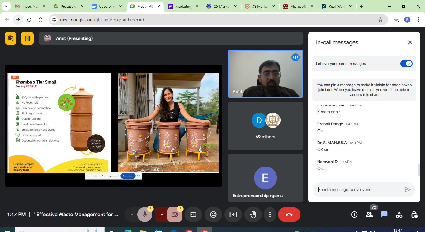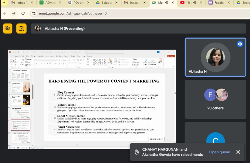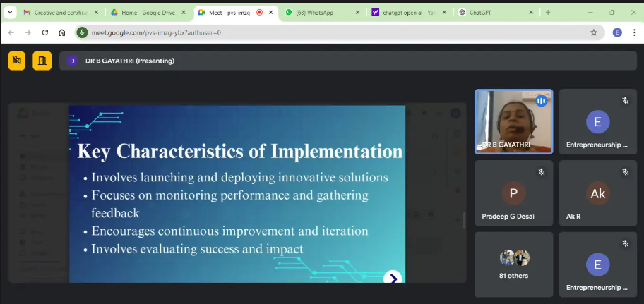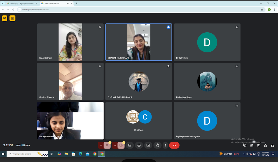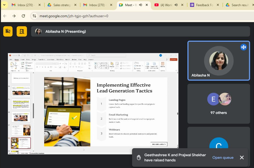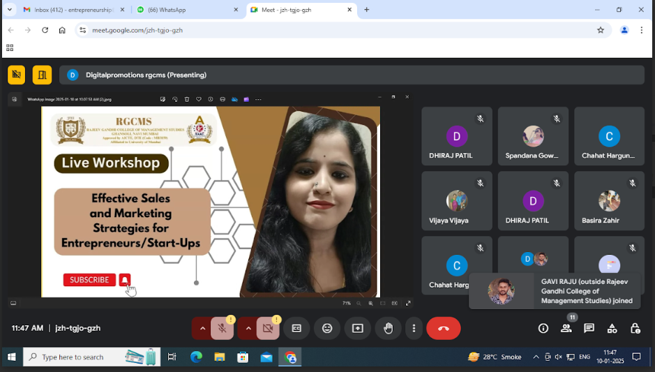 On January 10, 2025, a webinar titled “Workshop on Effective Sales and Marketing Strategies for Entrepreneurs/Start-Ups” was conducted via G-Meet with over 100 participants. Organized to help understand marketing strategies for new business ideas, the session was led by Dr. Abilasha N., who shared practical insights on navigating sales and marketing challenges. She discussed leveraging digital platforms, content marketing, and social media to boost brand visibility and audience engagement. The session also covered lead generation, data-driven strategies, and real-life startup examples like Zepto to illustrate effective marketing approaches for business growth.