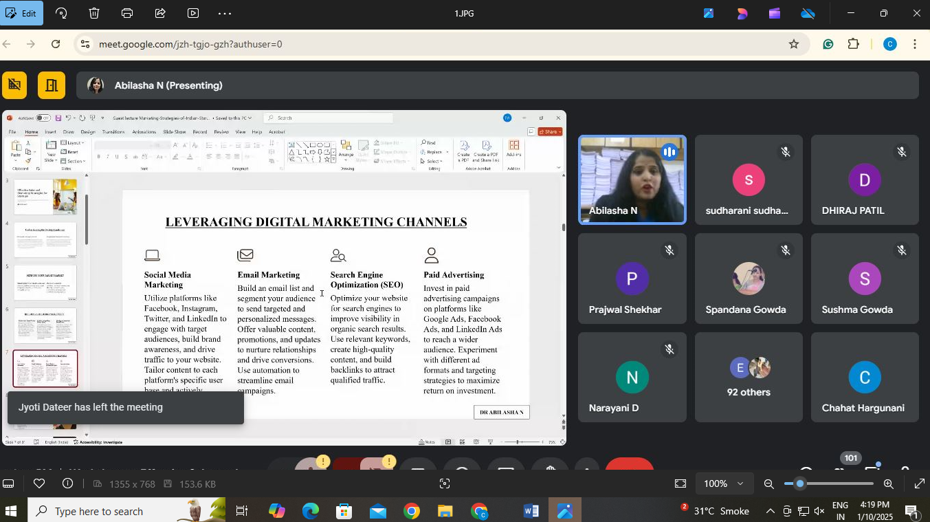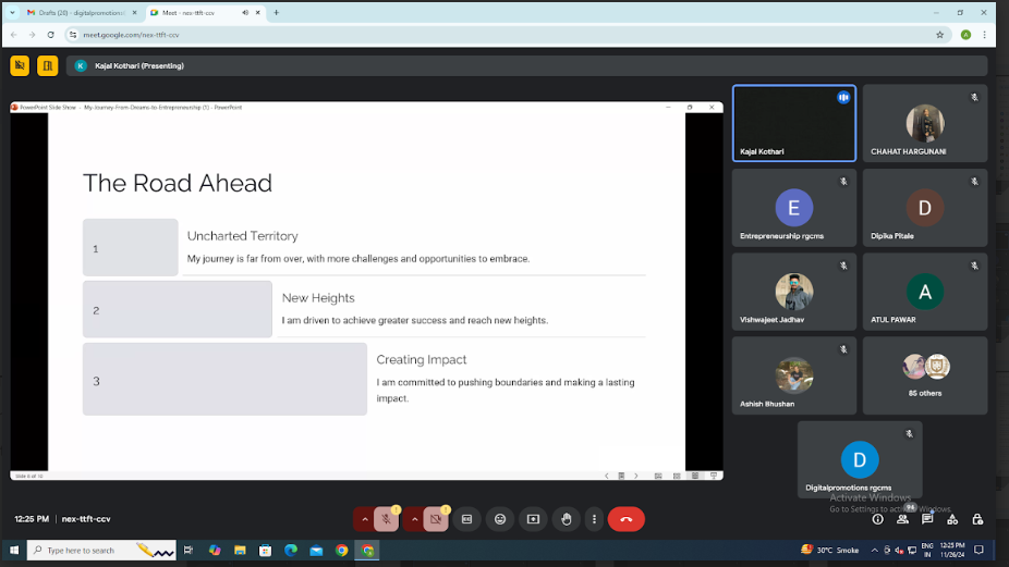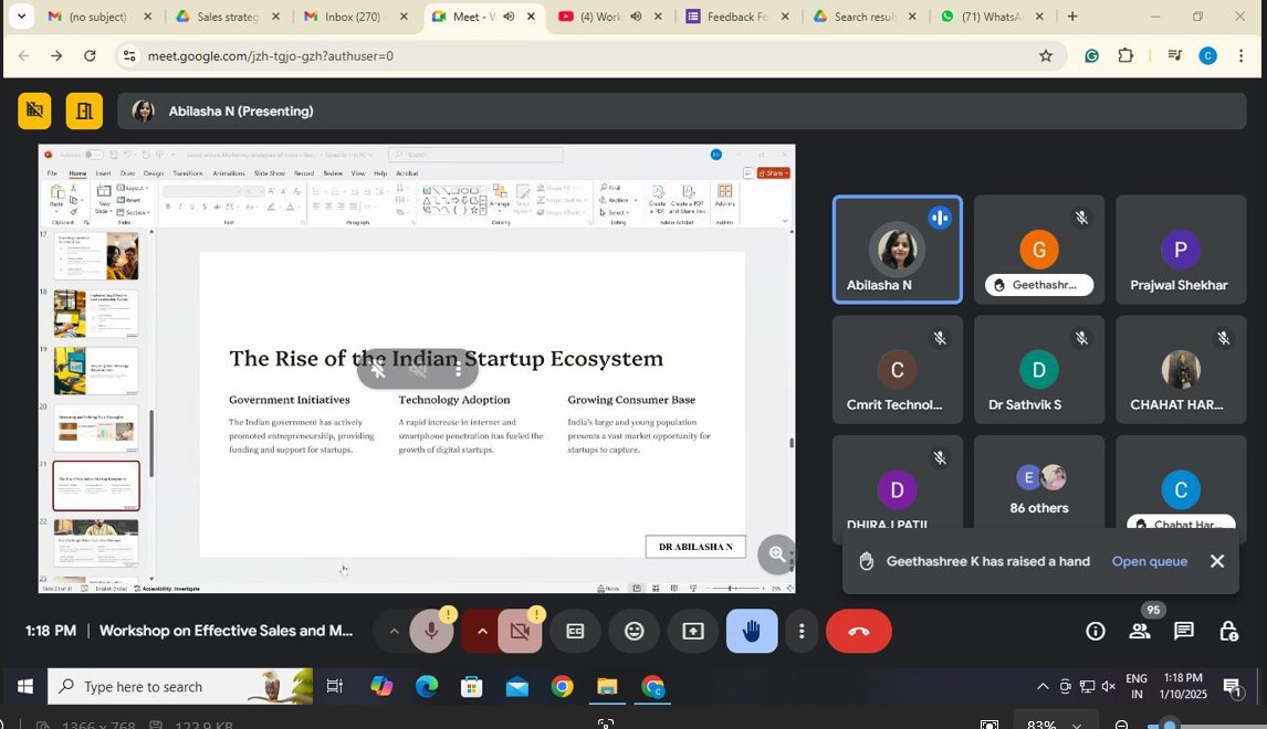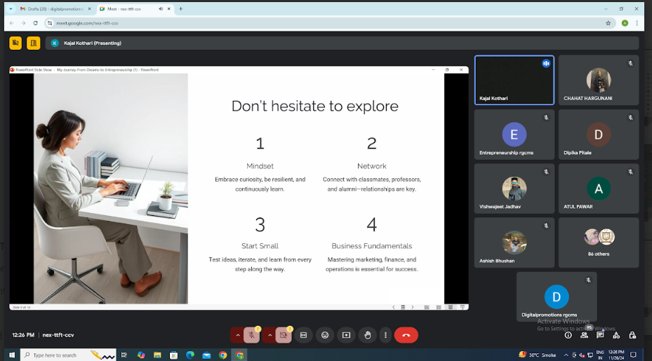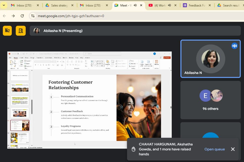 On January 10, 2025, a webinar titled “Workshop on Effective Sales and Marketing Strategies for Entrepreneurs/Start-Ups” was conducted via G-Meet with over 100 participants. Organized to help understand marketing strategies for new business ideas, the session was led by Dr. Abilasha N., who shared practical insights on navigating sales and marketing challenges. She discussed leveraging digital platforms, content marketing, and social media to boost brand visibility and audience engagement. The session also covered lead generation, data-driven strategies, and real-life startup examples like Zepto to illustrate effective marketing approaches for business growth.
