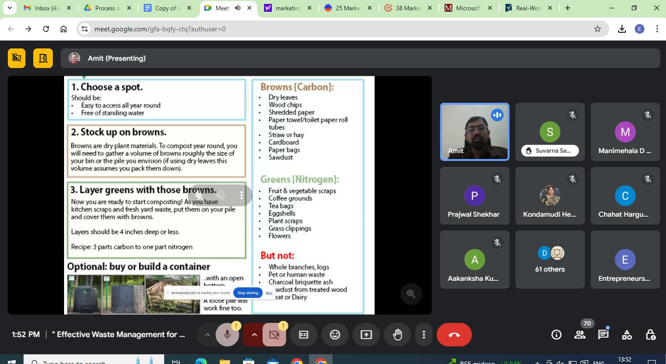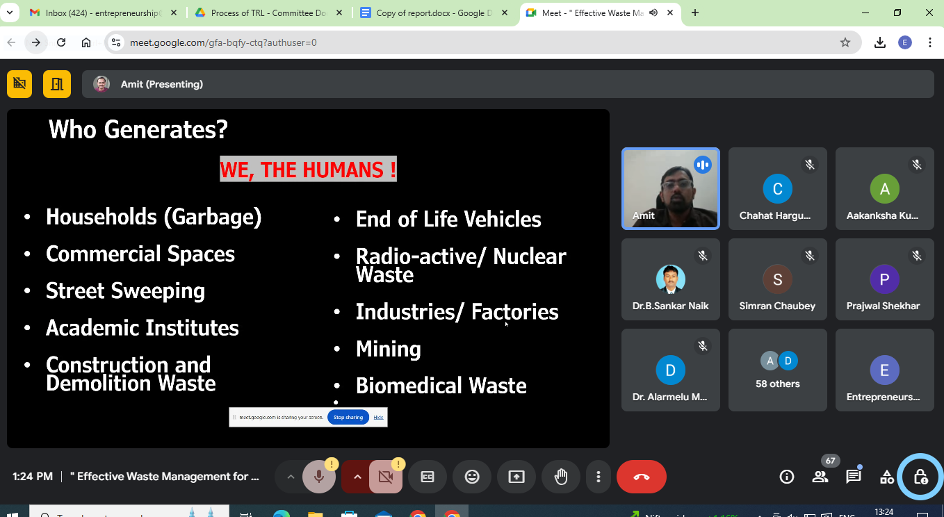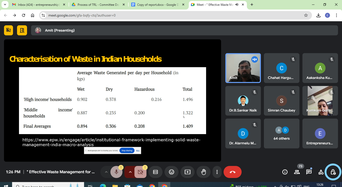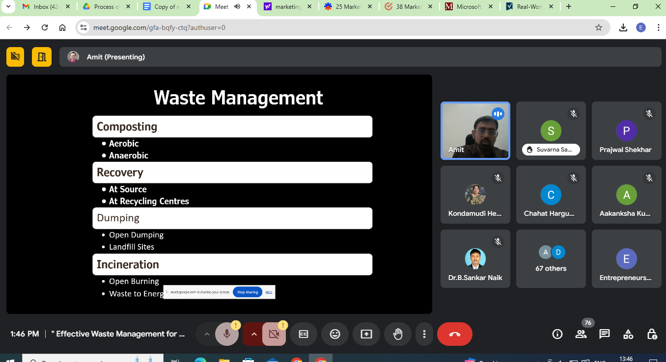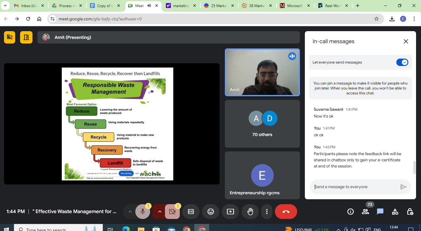 On December 14, 2024, the Institute Innovation Council organized a webinar on “Effective Waste Management for a Sustainable Future” to mark National Conservation Day, with over 100 participants. Resource person Mr. Amit Yadav, a PhD scholar specializing in Municipal Solid Waste Management at TMC, provided insights into waste generation, types of waste, and India’s ranking in global waste production. He highlighted government initiatives, hospital waste disposal practices, and the impact of poor air quality on health. The session emphasized the 5Rs—Reduce, Reuse, Recycle, Recovery, and Landfill—and introduced simple composting methods using three pots. The interactive session encouraged participants to adopt sustainable practices, starting at home.