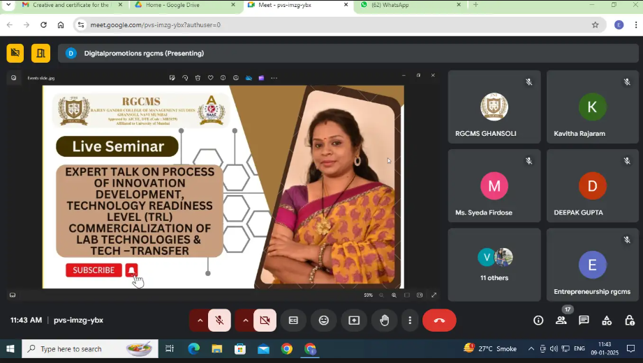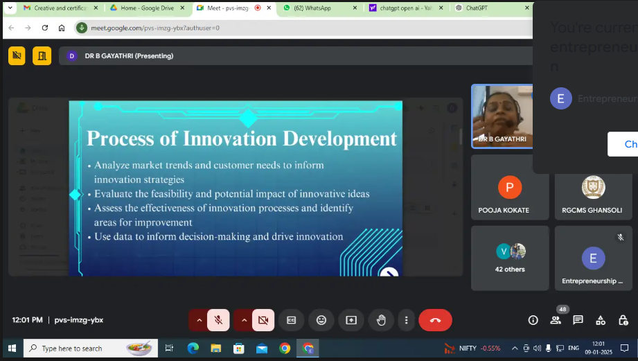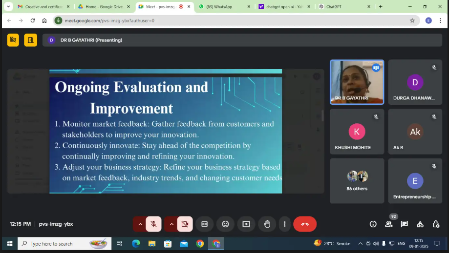 On January 9, 2025, the Institute Innovation Council organized an insightful online session via G-Meet, with over 100 participants, led by resource person Dr. B. Gayathri. The session focused on the innovation process, business strategy, incubation, and startup development. Dr. Gayathri shared valuable insights on prototyping, ideation, and strategic planning using real-life examples like Apple. She emphasized the importance of research, brainstorming, and seizing opportunities. The discussion covered the incubation phase, acceleration, and implementation of innovative ideas. She also explained the Technology Readiness Level (TRL), assessing technology maturity, risks, resource allocation, and commercialization challenges, providing a comprehensive overview of innovation to launch.