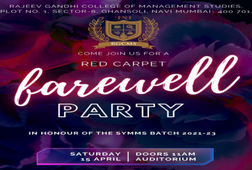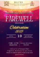The Farewell Celebration for Batch 2022–24 was held on 28th April 2024 in the RGCMS Auditorium with 60 students. Organized by juniors, the event began with a warm welcome speech by faculty, recalling achievements and memories. Highlights included fun competitions, the crowning of Mr. & Ms. Farewell, and a nostalgic video montage. Faculty shared best wishes, followed by a lively celebration with food and music, marking a memorable send-off.